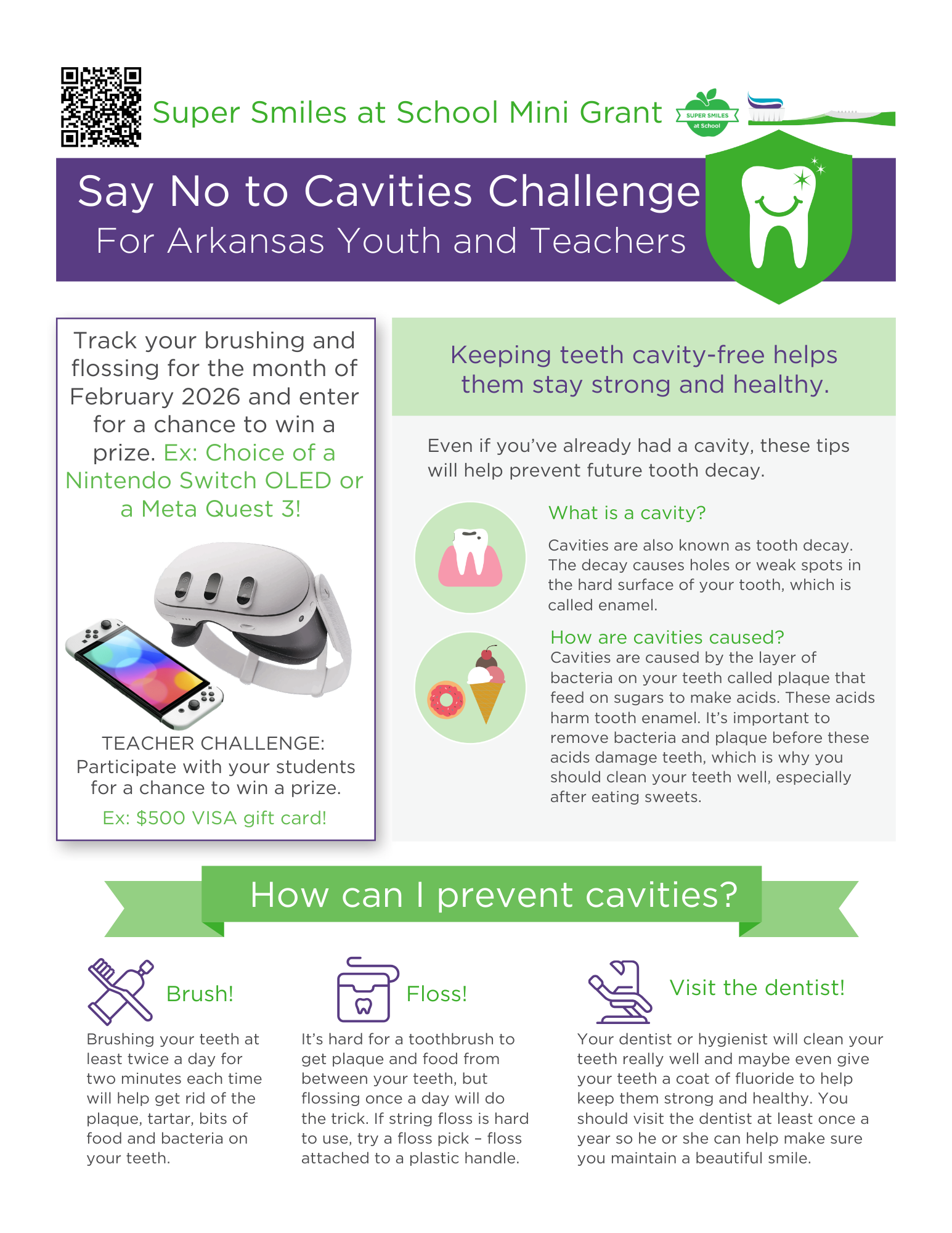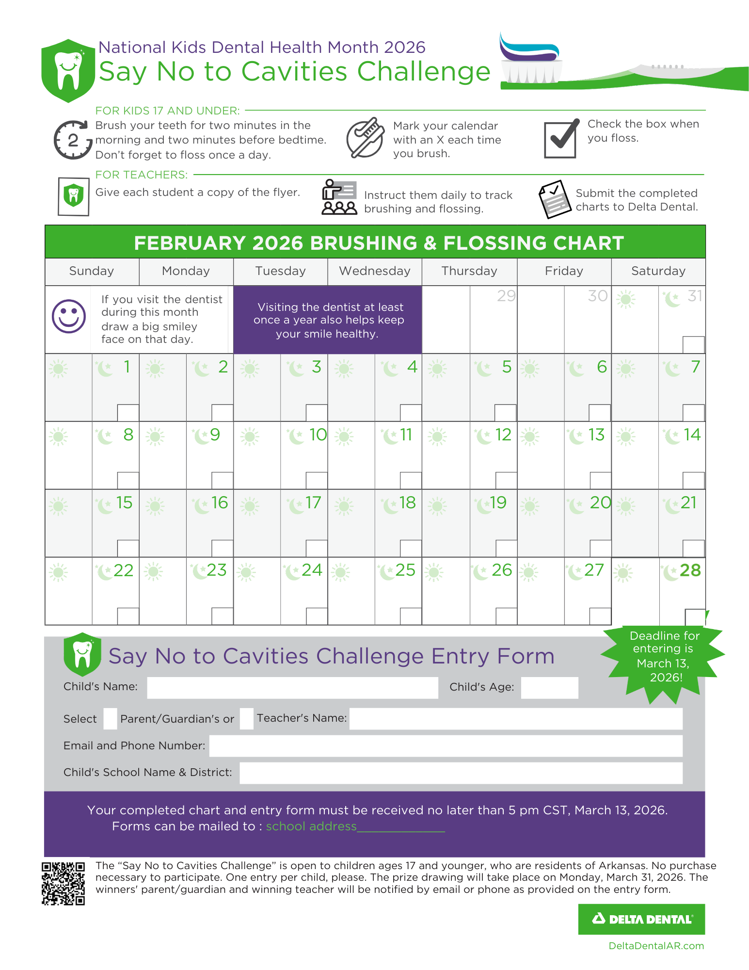 Join us and participate in our Say No to Cavities challenge every February as part of National Children's Dental Health Month. The month-long contest encourages Arkansas kids and their families to brush and floss daily and track their progress on a Say No to Cavities calendar sheet.